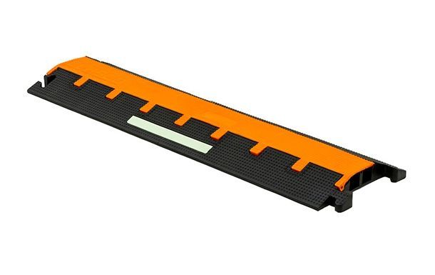 The LiteGuard collection of cable protectors is built to shelter electrical cables and hoses from vehicle traffic in warehouses, at indoor jobsites, garages, venues, arenas, offices, and more. This specific model features two 1.25” square channels, a black base with an orange lid, and two Elasglow glow-in-the-dark stripes for added visibility. Manufactured in the USA with polyurethane and a fiberglass rod, these cable protectors are far more durable than rubber, plastic, or metal alternatives.