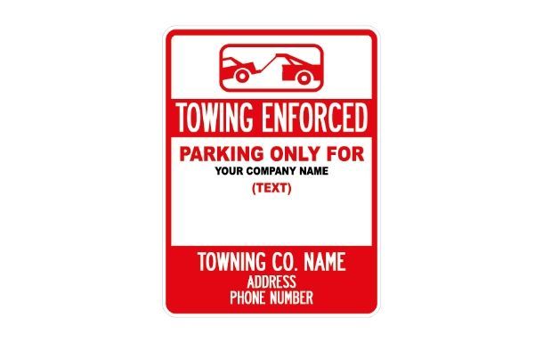 These customizable towing enforcement signs are designed for long-term use in private parking lots, commercial properties, and residential complexes. The pre-formatted layout displays a clear towing warning and allows you to insert your property name along with towing company information. Available in two sizes, both printed on .080 aluminum with Engineer Grade reflective sheeting for outdoor visibility and durability.